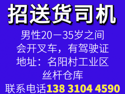 丝杆仓库招送货司机一名要求男性20-35岁之间,会开叉车,有驾驶证,地址:名阳村工业区。