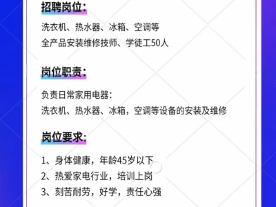 海尔智家招聘洗衣机、热水器、冰箱、空调等安装维修技师、学徒工,45岁以下,管住不管吃,6000-20000能正常安装维修后不低于一万,地址天津市北辰区三千里宜鹏园底商