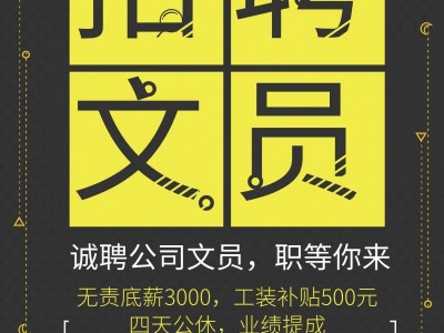 招聘公司文员,待遇:无责底薪3000,工装补贴500元,四天公休,业绩提成,五险一金,免费午餐