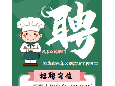 邯郸市永年区刘营镇学校食堂招聘帮厨大姐多名(90/100)具体工资详谈,打烧饼师父3名要求有技术,会和面,会烙饼,(多种花样的饼)具体工资详谈!要求年龄不超过55周联系电话,18830954189微信同步