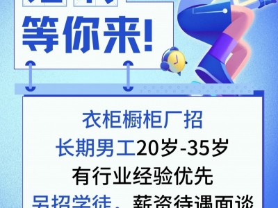 招聘:衣柜橱柜厂招长期男工,20岁-35岁,有行业经验优先,另招学徒,薪资待遇面谈。