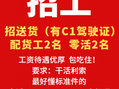 天津标准件门市:招送货(有C1驾驶证)配货工2名,零活2名 工资待遇优厚,包吃住!要求:干活利索,最好懂标准件的