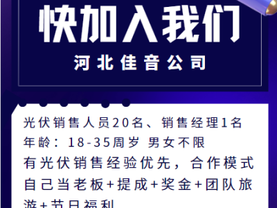 河北佳音公司招聘光伏销售人员20名、销售经理1名,年龄:18-35周岁 男女不限