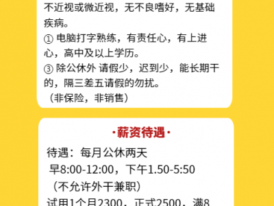 招聘电脑办公文员一名,女20-27岁,能长期的。(非保险,非销售)公休两天, 试用1个月2300,正式2500,满8个月2800,满一年3000,加微信备注应聘