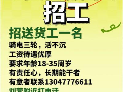 招工:河北铺门市招送货工一名,骑电三轮,活不沉,工资待遇优厚,要求年龄18-35周岁,有责任心,长期能干者,有意者联系 刘营附近打电话,离刘营远的不要打电话,只限打电话