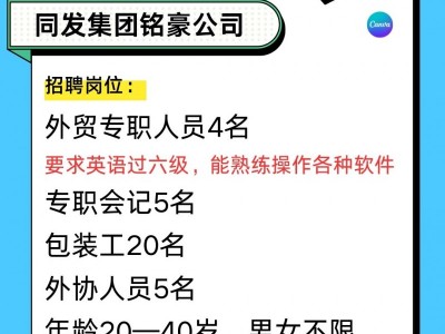 同发集团铭豪公司招聘:外贸专职人员4名(要求英语过六级,能熟练操作各种软件。)专职会记5名,包装工20名,外协人员5名,年龄20—40岁,男女不限,条件优越,待遇优厚。工作地址:东召庄南(物流园)同发路。联系电话;17531309202