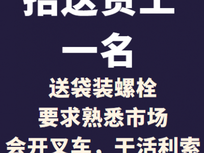 招送货工一名,送袋装螺栓,要求熟悉市场,会开叉车,干活利索。