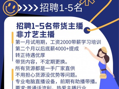 招聘:带货主播,20-35岁,带薪培训。转正后底薪4000+提成,待遇优厚,前期有助播带播。准时准点上下班,每天直播3+2+3小时。地址:中召庄永富电子商务有限公司