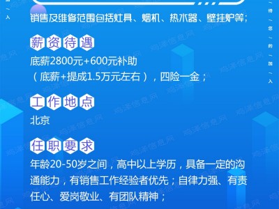 因业务规模扩展现招聘销售及维修精英,销售及维修范围包括灶具、烟机、热水器、壁挂炉等;