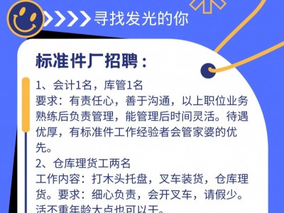 1、会计1名,库管1名,要求:有责任心,善于沟通,以上职位业务熟练后负责管理,能管理后时间灵活。待遇优厚,有标准件工作经验者会管家婆的优先。