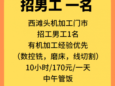 西滩头机加工门市招工男工1名,有机加工经验优先,(数控铣,磨床,线切割)10小时/170元/一天,中午管饭