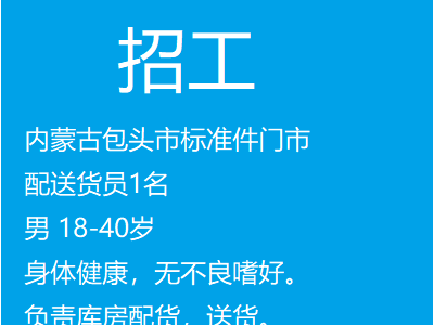 内蒙古包头市标准件门市招聘送货工人,活不沉,管吃住,老板永年人,干满1月报销来回路费。 有意者联系