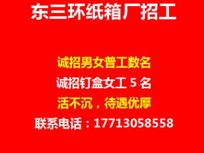 东三环纸箱厂招聘男女普工数名,钉盒女工5名,活不沉,待遇优厚,欢迎加入联系电话