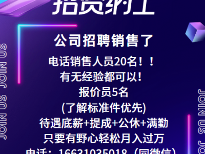 招聘电话销售人员20名!!