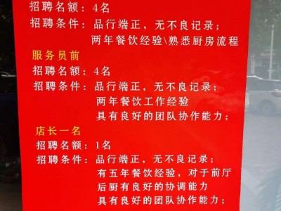 渔七爷双拼烤鱼。招聘如下。后厨四名,前台三名店长一名