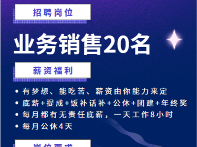 招聘业务销售20名、18-40岁。有责任心,有上进心,有经验者、会电脑者优先。每月都有责任底薪,一天工作8小时,公休四天,地址:名关铁西钵白路