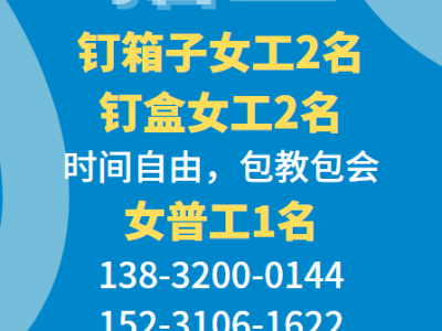 招工:龙泉纸箱厂招钉箱子女工2名,钉盒女工2名,时间自由,包教包会。女普工1名。电话13832000144 (微信不聊,请电话联系)