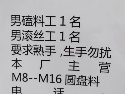 男磕料工1名 男滚丝工1名 要求熟手,生手勿扰 主营M8--M16 圆盘料 地址:永年区西滩头工业区