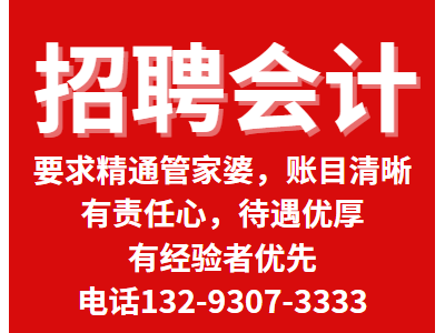 招聘会计,要求精通管家婆,账目清晰,有责任心,待遇优厚,有经验者优先,电话13293073333,15175072666
