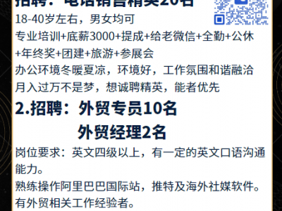 招聘:电话销售精英20名,18-40岁左右,男女均可,专业培训+底薪3000+提成+给老微信+全勤+公休+年终奖+团建+旅游+参展会