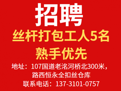 招聘:丝杆打包工人5名,熟手优先。地址:107国道老洺河桥北300米,路西恒永全扣丝仓库