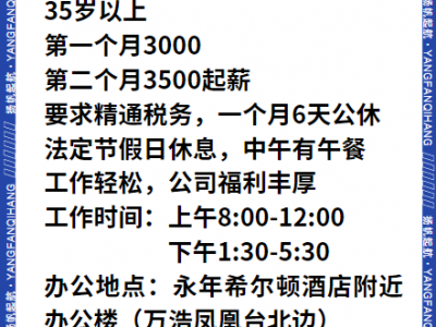 招聘外帐会计,35岁以上。第二个月3500起薪,要求精通税务,一个月6天公休,法定节假日休息,中午有午餐,公司福利丰厚。地点希尔顿酒店附近办公楼(万浩凤凰台北边)