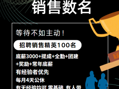 招销售精英100名,底薪3000+提成+全勤+团建+奖励
