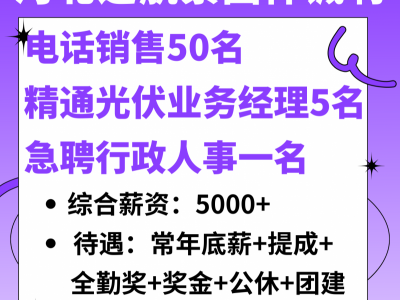 河北远航紧固件诚聘:电话销售50名,精通光伏业务经理5名,急聘行政人事一名,综合薪资:5000+ 待遇:常年底薪+提成+全勤奖+奖金+公休+团建 月入过万不是梦