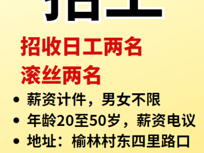 招收日工两名, 滚丝两名,薪资计件,男女不限,年龄20至50岁,薪资电议