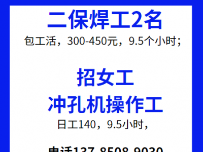 招二保焊工2名,包工活,300-450元,9.5个小时;