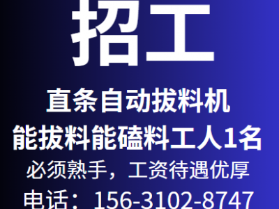 招工,直条自动拔料机,能拔料能磕料工人1名,必须熟手,工资待遇优厚。