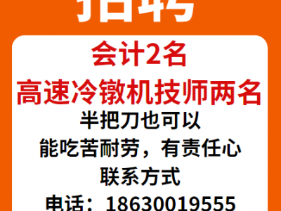 [招聘]招聘,会计2名,高速冷镦机技师两名,半把刀也可以,能吃苦耐劳,有责任心,联系方式 电话:18630019555
