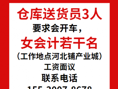 高薪招聘仓库送货员3人,要求会开车,女会计若干名(工作地点河北铺产业城)工资面议,地址:名关铁西工业区