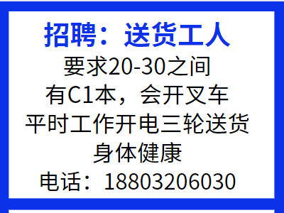 招聘:送货工人,要求20-30之间,有C1本,会开叉车,平时工作开电三轮送货,身体健康,电话:18803206030 另招聘:双机机手(要求熟手),打栓,在段庄工业区,电话:13603308068