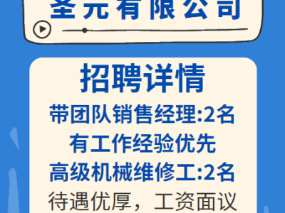 招聘带团队销售经理:2名,有工作经验优先。高级机械维修工:2名,待遇优厚,工资面议,真诚欢迎您的加入!