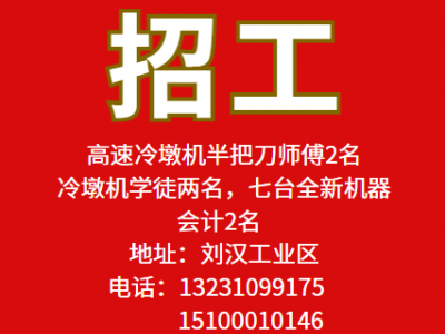 招高速冷墩机半把刀师傅2名,冷墩机学徒两名,七台全新机器,会计2名