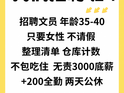 招聘文员 年龄35-40只要女性 不请假 整理清单 仓库计数 不包吃住 无责3000底薪+200全勤 两天公休 地址:河北铺中队北侧胡同路南 河北诚亿仓库
