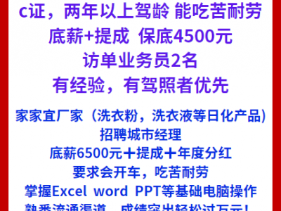 家家宜厂家(洗衣粉,洗衣液等日化产品)招聘城市经理,底薪6500元➕提成➕年度分红,要求会开车,吃苦耐劳,掌握Excel word PPT等基础电脑操作,熟悉流通渠道,成绩突出轻松过万元!
