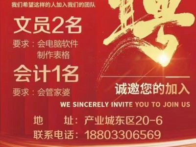 招聘。招聘文员两名:要求会电脑办公软件,制作表格;会计一名,要求会管家婆。月休四天,薪资面议,来了有人交,简单好上手。有意向直接加图片微信或打电话,