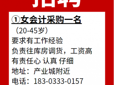 诚聘~~女 会计采购一名(20-45岁)要求有工作经验,负责往库房调货,工资高,有责任心 认真 仔细