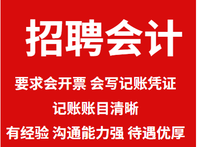 招聘门市会计,要求会开票,会写记账凭证,记账账目清晰,有经验、沟通能力强,待遇优厚,电话13293073333,15175072666