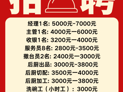 经理1名: 5000元-7000元 主管1名: 4000元一6000元 收银1名: 3200元一4000元 服务员8名: 2800元-3500元 撤台员2名: 2400元一3000元 后厨出品: 3000元-3800元 后厨切配: 3500元一4000元 后厨加工: 3000元一3800元 ;洗碗工(小时工):3000元;以上人员入职后公休3天!+全勤奖+绩效奖 +工龄奖。一律包吃包住。 地址: 万嘉购物超市北60米路东 晶木KTV南30米 经理13293088408