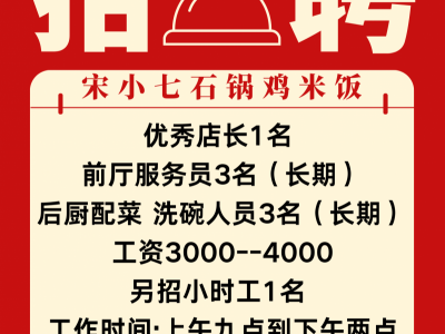 天骏美食街,宋小七石锅鸡米饭,招优秀店长1名,前厅服务员3名(长期),后厨配菜,洗碗人员3名(长期),工资3000--4000