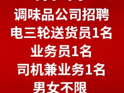 调味品公司招聘,电三轮送货员1名,业务员1名,司机兼业务1名。男女不限