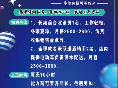 招聘全职或者兼职送酒骑手1名,每天10小时,店内提供电动车负责酒水配送,月薪2500-3000。