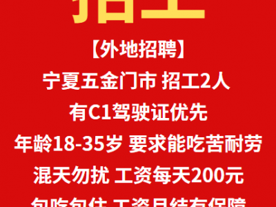宁夏五金门市招工2人,有C1驾驶证优先,年龄18-35岁,要求能吃苦耐劳,混天勿扰,工资每天200元,包吃包住,工资月结有保障
