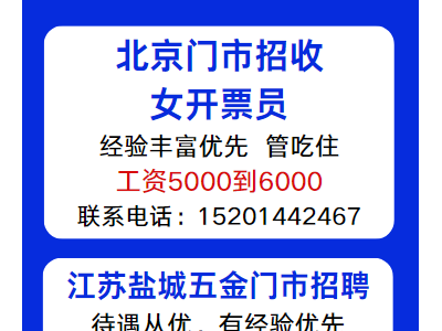 北京门市招收女开票员,经验丰富优先,工资5000到6000。管吃住。联系电话:15201442467