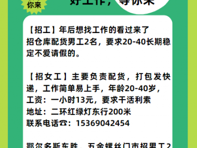 鄂尔多斯东胜,五金螺丝门市招男工2名,年龄16-45均可,会否开车都可以,联系电话:18648007608 15849769880