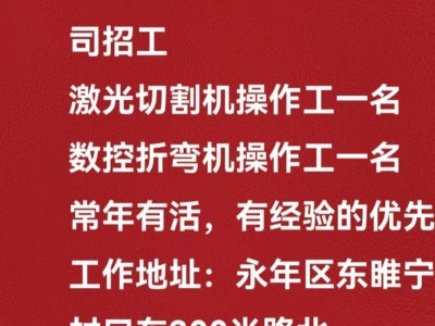 河北锐铝金属制品有限公司常年招工 6000瓦激光切割机操作工一名 数控折弯机操作工一名 普工3名 常年有活有经验的优先 手机微信同步: