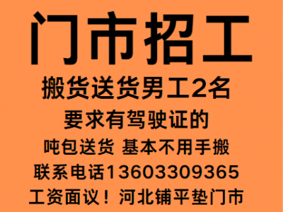 河北铺平垫门市招搬货送货男工2名,要求有驾驶证的,吨包送货,基本不用手搬,工资面议!